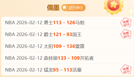 上一场赛事,2026-02-12奥兰多魔术108-116 [51-52]密尔沃基雄鹿,比赛开始,贝恩连中3记三分,但库兹马里突外投连砍11分强势回应,双方展开拉锯战,贝恩继续保持手感扔进第5记三分,首节魔术领先4分,次节双方展开拉锯战,魔术试图拉开比分但雄鹿总有人能回应,小波特连续突破带领雄鹿半场反超1分。下半场,双方比分继续胶着,托马斯站出来里突外投单节轰下15分,雄鹿三节反超5分,末节双方始终拉不开比分,小波特达成三双,贝恩接连三分能回应,关键时刻班凯罗扣飞,特纳关键三分命中后托马斯超远三分,最终雄鹿116-108魔术。托马斯34分4板2助、波特18分10板11助2帽、希姆斯17分11板2助、吉昂17分3板、库兹马15分7板2助、AJ·格林6分1板2助、