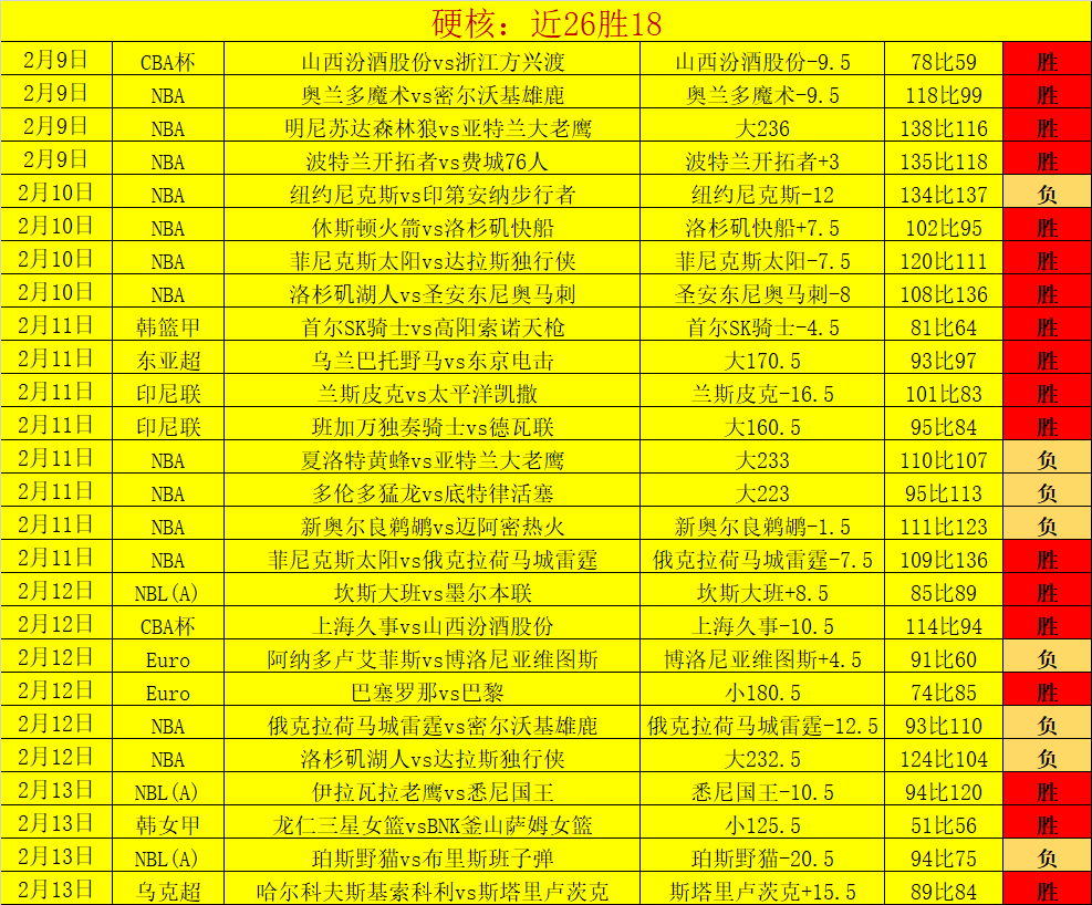 昨天完场4胜3,近6天胜5天,近26场胜18场,目前整体值得认可,状态出色