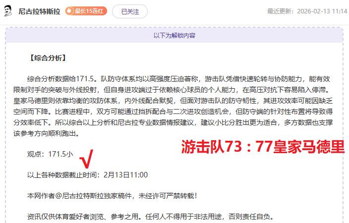 最近更新:2026-02-14 11:33 最长15连红