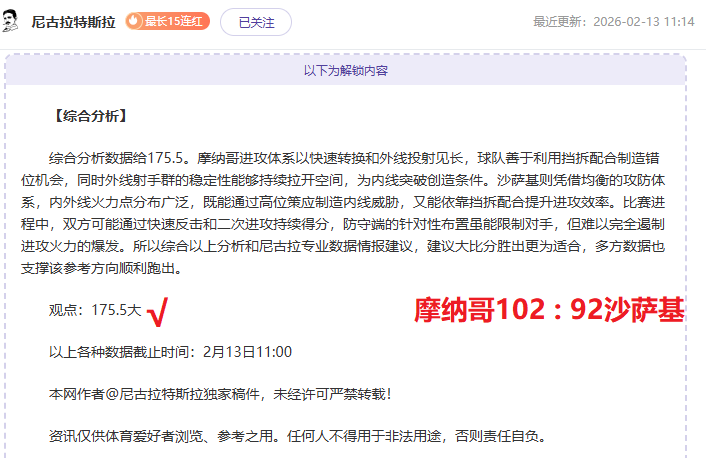 解锁内容包括:综合分析+比赛建议(数据观点+附加观点)