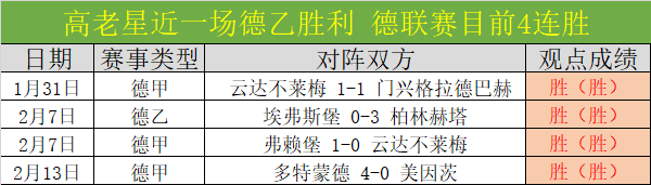 近一场德乙胜利,德联赛4连胜信心充足。二月过去13天胜9天,累计胜+5,二月表现出色