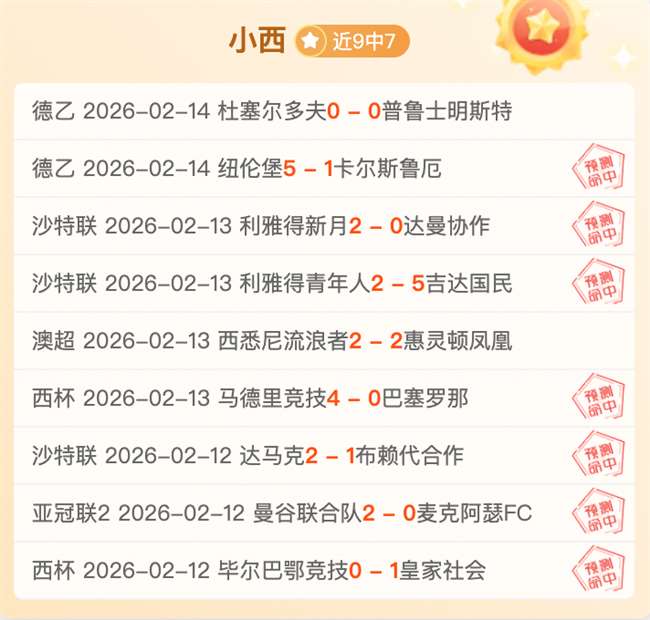 最近更新:2026-02-14 13:52 德乙近16胜率81%近9中7