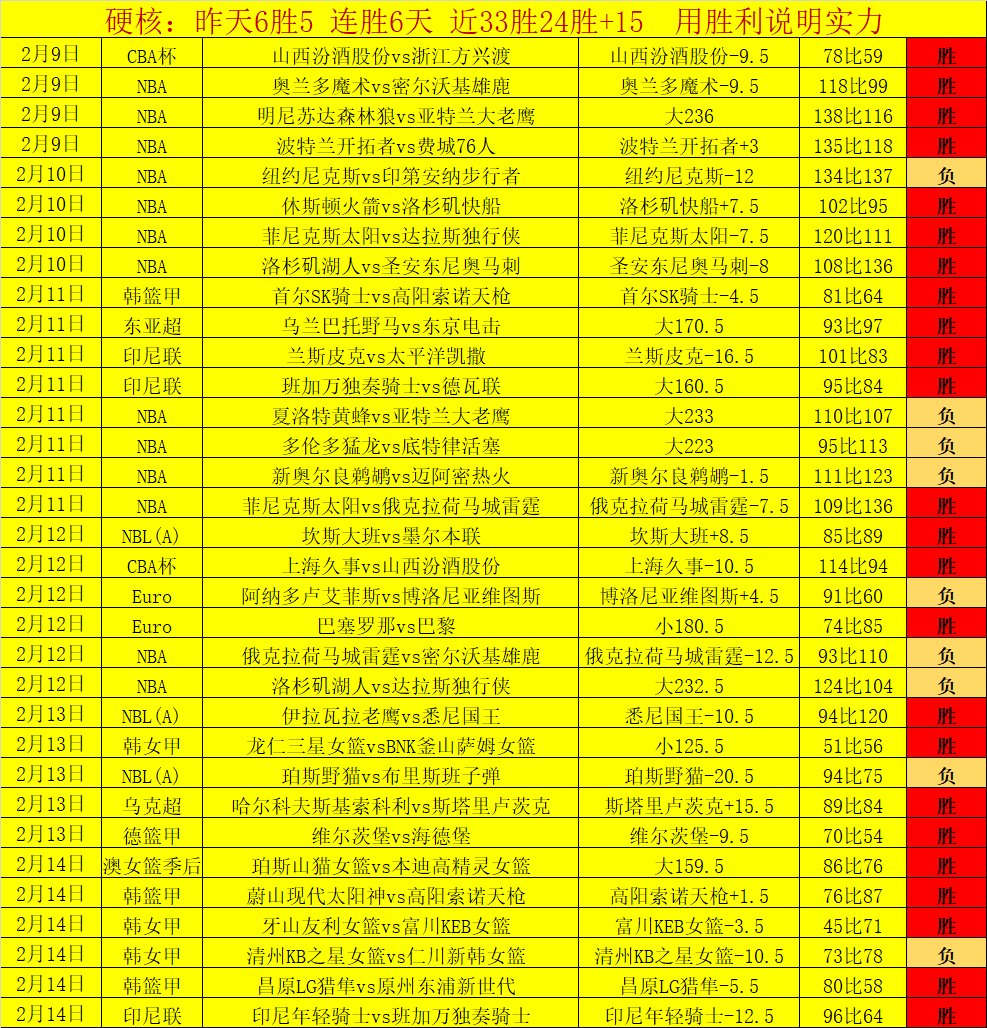 昨天6胜5,连胜6天,近33场胜24场胜+15,用胜利说明实力高超