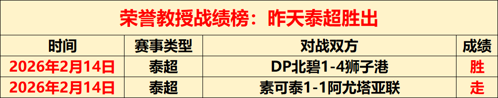 昨天泰超取胜,2场不败,最高打下14连胜的表现已见证实力。各线赛事都能保证清晰的解读思路与靠谱的选择方向!截至昨天荣誉教授已经有4690场解读经验,今天继续精选5场,多元化的赛事系列,以更高连胜胜利率绩迎接5000场记录来临,关注荣誉教授,成为荣誉教授的好伙伴!