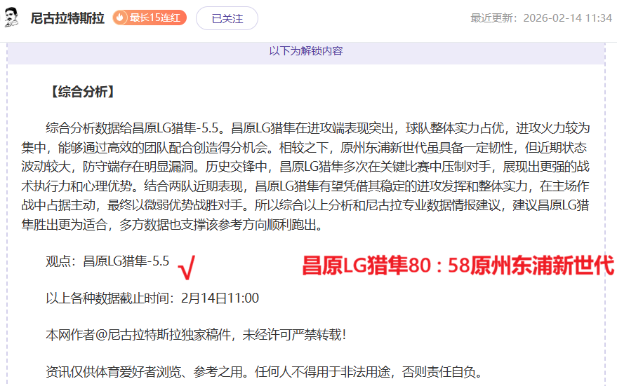 【成绩回顾】昨拿下2战胜!昨NBL+韩篮甲拿下胜利!信心赛事多项拿下连胜,尼古拉资深作者情报解读再有方法,信心强项情报解读连胜赛事再次出发,长期解读惊喜不断,此前作者创下4次双位数胜战绩,掌握着一手赛事资深情报,本期继续分享充满奇妙体育赛事,敬请大家持续关注!!
