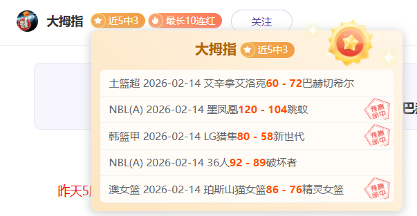 最近更新:2026-02-15 13:42 近4中3最长10连红