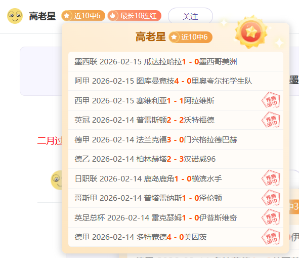 阿甲近22胜15,长时段保持精彩的赛事。二月过去13天胜9天,累计胜+5,二月表现出色
