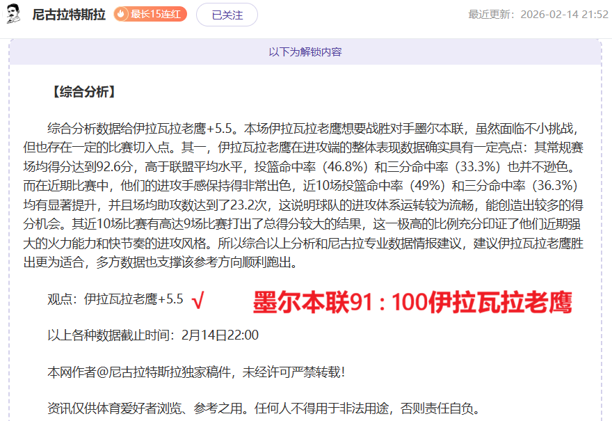 解锁内容包括:综合分析+比赛建议(数据观点+附加观点)