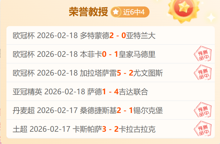昨天欧冠4场仅负1,欧冠8胜6,最高打下14连胜的表现已见证实力。各线赛事都能保证清晰的解读思路与靠谱的选择方向!截至昨天荣誉教授已经有4705场解读经验,今天继续精选5场,多元化的赛事系列,以更高连胜胜利率绩迎接5000场记录来临,关注荣誉教授,成为荣誉教授的好伙伴!
