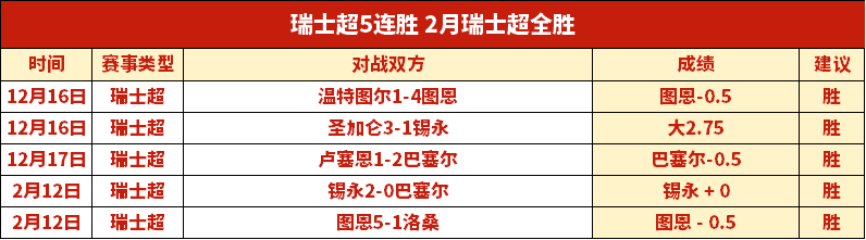 成绩汇报:瑞士超5连胜,2月瑞士超拿下全胜记录。近期18胜11,笔者近期前进脚步表现仍然优秀,本日赛程继续出击!
