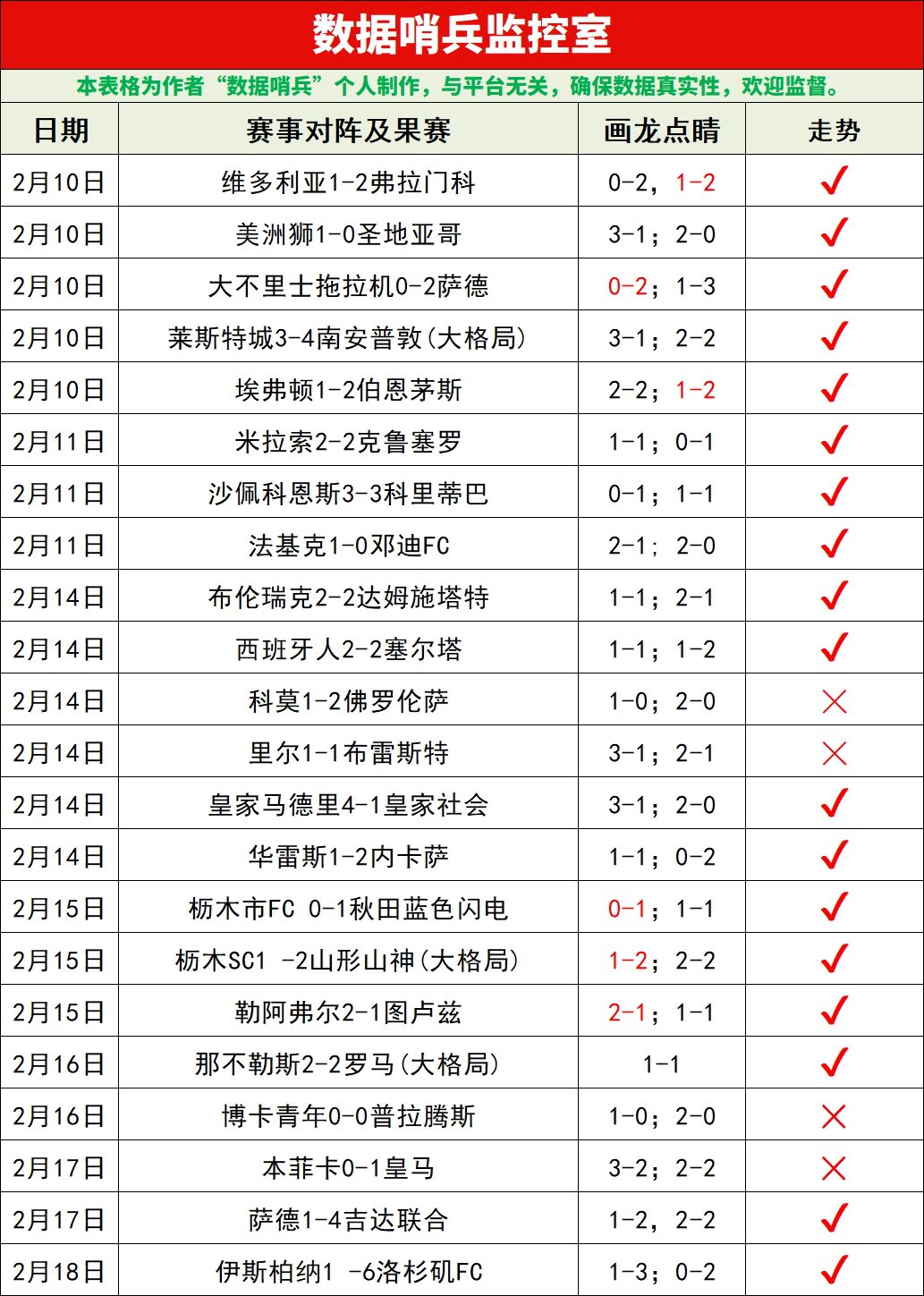 22红18稳步向前,六场“画龙点睛”配佩成功,目前2连红当中,皇马菜鸡只一球小胜,意想之外,不过成绩依旧稳定,数据哨兵为你在一众比赛当中精挑细选,尊重概率。