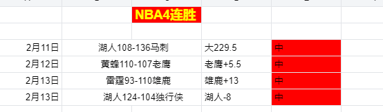 NBA全明星前,NBA取得4连胜,状态思路清晰明天精选两场。争取都拿下共同进步~~