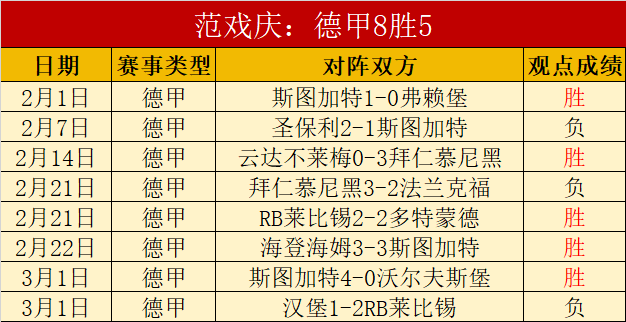 德甲二月至今取得8胜5十分精彩的赛事值得信赖。近5天胜3天胜+5,近期表现出色。二月28天胜20天,胜93场近负68场,胜+25,精彩的月成绩值得全面支持和信赖