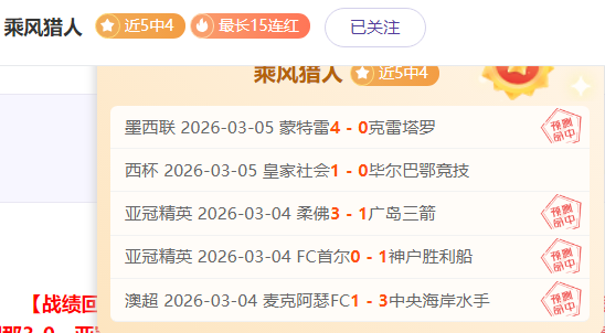 【战绩回顾】火热5胜4,昨日亮点亚冠又全胜,亚冠淘汰赛4场全胜,其中重点的柔佛再拿下,乘风重点场6天全胜,欢迎关注!每日仅1场(欢迎主页解锁,量少求精选,值得重点关注)!全力分析,只王牌精研有把握的比赛,信心继续拿下,加油冲全胜!欢迎长期关注乘风。