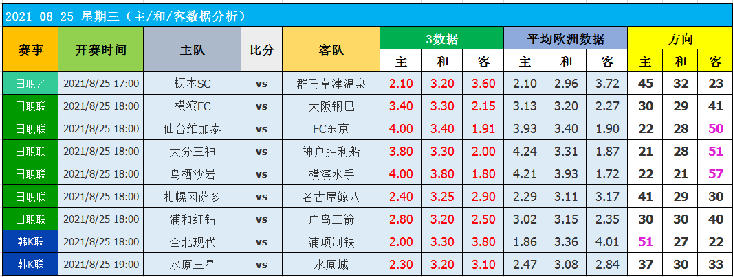 我们本栏目的数值数据由国外欧洲数据及平均欧洲数据一起构成对比,再根据中国竞彩历史类似数据分析结合,最后做最终的方向方向。