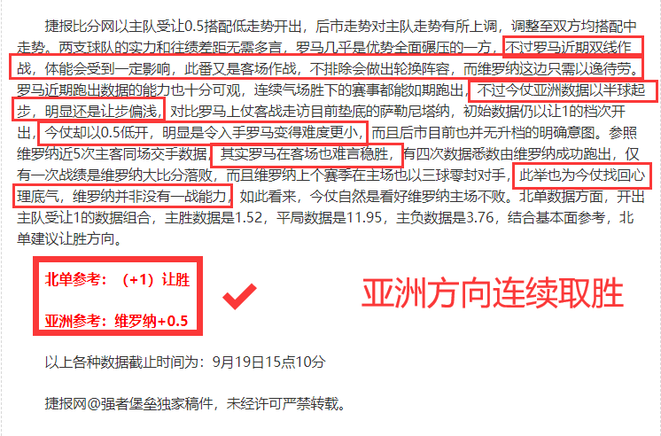 昨天强者堡垒在北单参考和亚洲参考继续拿下胜利,目前亚洲2连胜,整体亚洲成绩11胜8,整体成绩亚洲胜率73%。昨天精选场次为意甲 维罗纳vs罗马,罗马今赛季开场3战3胜,维罗纳今赛季开场3战3败,亚洲数据从初始对罗马作出半球让步,十分舒适让步档位,后市更是把舒适程度加大,下调到罗马让步平半,温水煮青蛙的危机需要警惕,强者堡垒觉察危机所在把青蛙从温水捞出,信心支持维罗纳不败亚洲受让,结果维罗纳3-2得到本赛季首捷,连胜的罗马截然而至,细心发现问题的强者堡垒再度取胜。