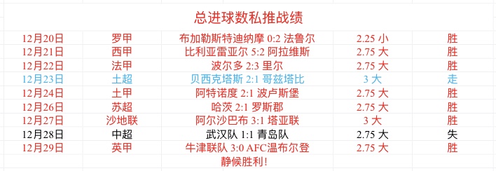 周三私推总进球数1场稳稳胜利,近8胜7,状态稳健!亚洲数据1场没有打出,近几天状态不佳,今晚如果没有特别看好的比赛就休息调整一天!鸡锅私推会持续保持精挑细选原则,在精不在多,必须全胜起飞!