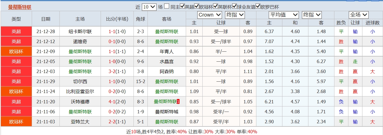 曼联作为英超的强队,球队的整体阵容和实力尚佳,本赛季联赛赛事取得8胜4平5负的成绩,积28分,球队本赛季整体表现有所下滑。上场联赛对战纽卡斯尔联,强弱对话,球队在场面上整体处于上风,但球队上半场开局就让对手纽卡斯尔联进入1球,之后很长时间球队持续进攻也未能实现破门,直到下半场后段才轰入1球,扳平比分,最终1-1握手言和。