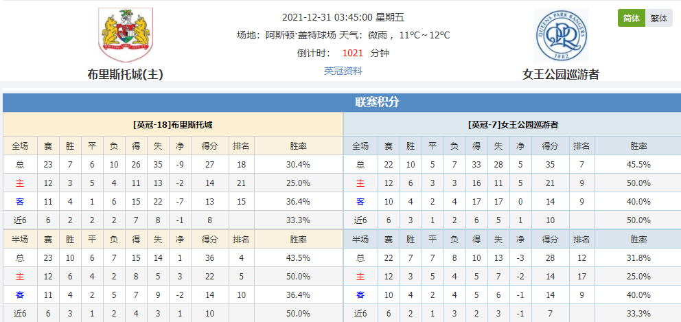 北京时间12月31日03:45,英冠第25轮赛事,布里斯托城对阵女王公园巡游者。布里斯托城上一役客场战败后遭遇不胜尴尬,再度坐镇主场的他们能否重振旗鼓?女王公园巡游者状态和境况接近,相比布里斯托城他们目前的优势明显,球队此役能否为升级目标拿走分数?