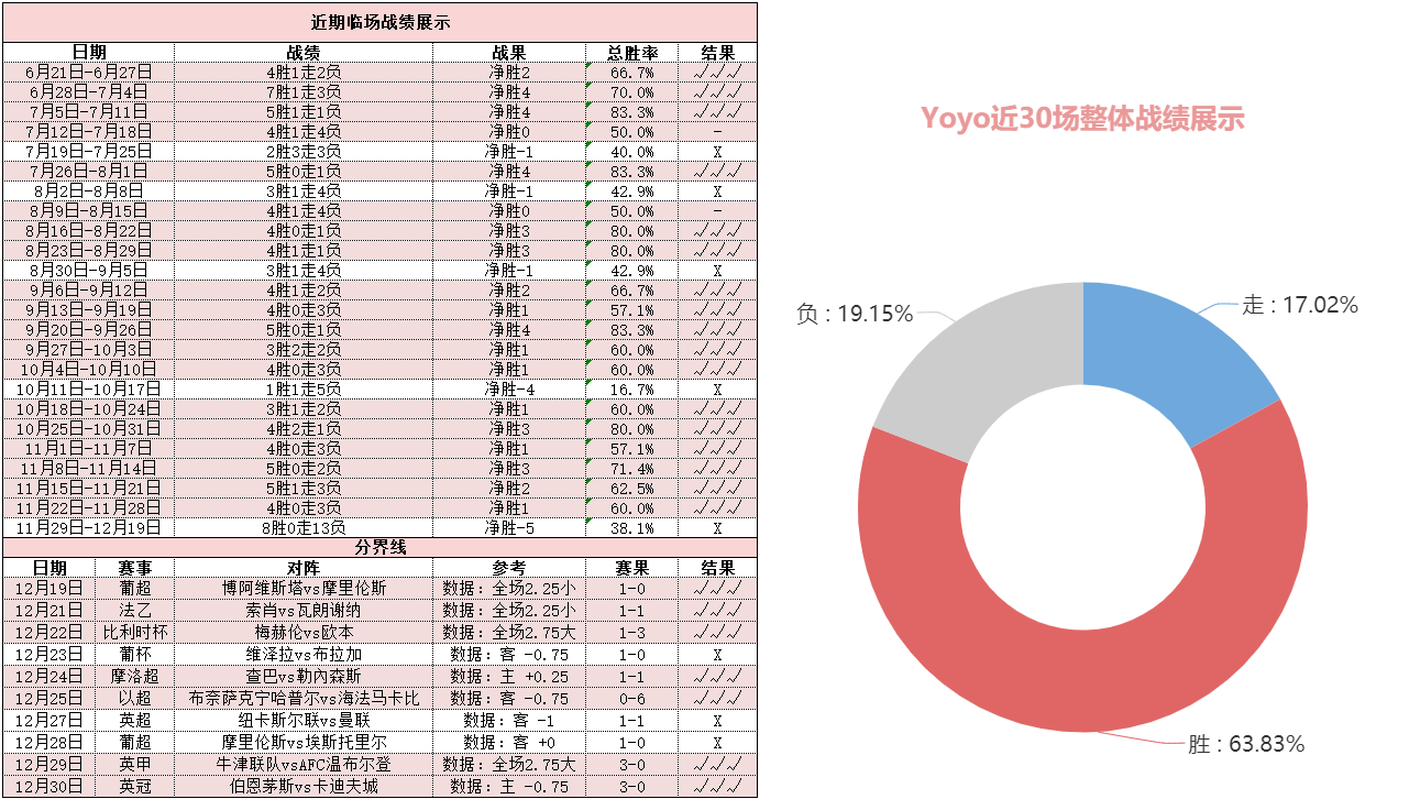昨晚周四临场英冠伯恩茅斯3-0稳稳打出,最近10场临场战绩为10胜7,整体表现尚可!而公推葡超波尔图同样3-1拿下,竞彩、亚洲方向双双笑迎喜悦!——而今天重点参考场次已经确认,信心依旧,2021年的最后一天一起追随Yoyo的步伐加油加油鸭~