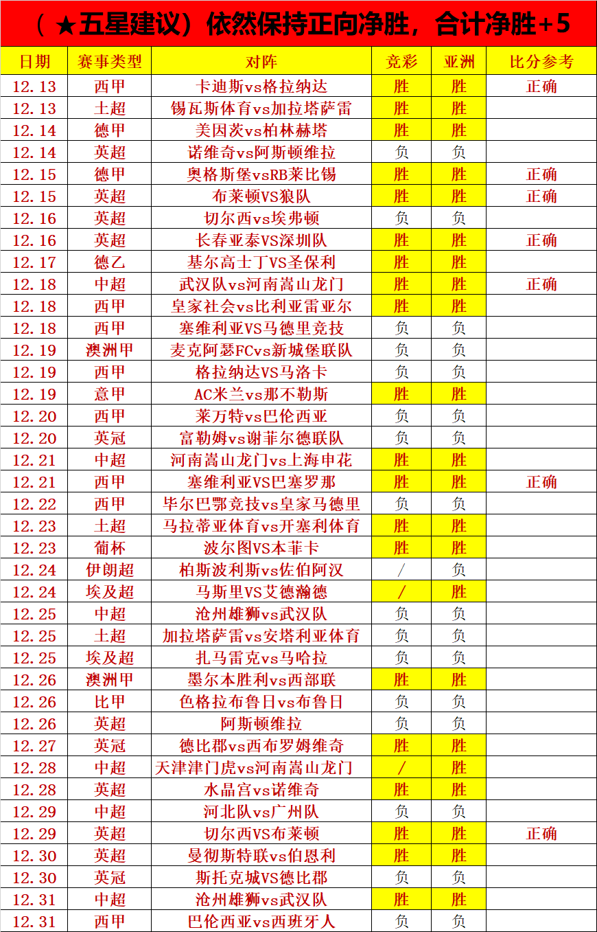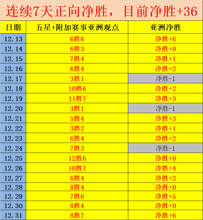 战绩说明:五星+附加赛事近19天亚洲净胜+36,12月完美收官