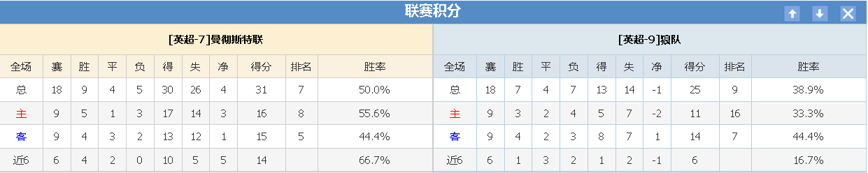 通过以上联赛成绩对比,双方主客成绩相当,虽然狼队积分位置不及曼彻斯特城,但是差距不大,此轮对比是曼彻斯特联稍占据优势。