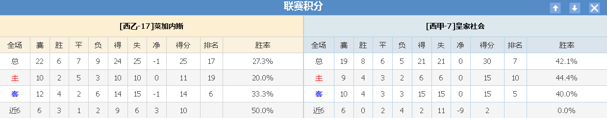 莱加内斯目前西乙联赛完成了22场比赛,成绩是6胜7平9负,积分25分,排名第17;主场完成了10场比赛,成绩是2胜5平3负,主场胜率是20%,主场成绩排名第19。