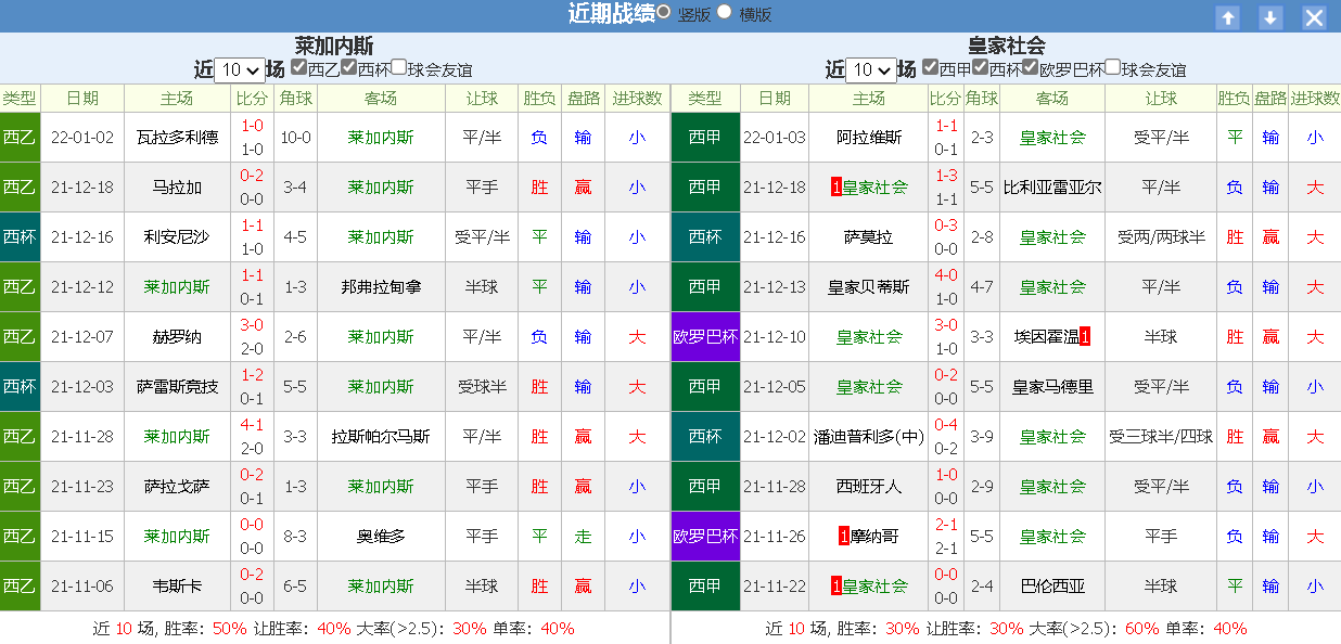 通过以上联赛成绩对比,两队不属于同一联赛级别,不过莱加内斯在西乙下沉至保级区间,皇家社会在西甲仍然处于中上游水平,此轮对比是皇家社会占据优势。