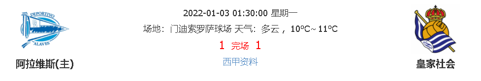 皇家社会在1月3日进行了一场西甲联赛,目前休战2天,上一场比赛为作客对阵联赛保级球队的阿拉维斯,双方战罢90分钟,在领先一球的情况下无法守住赛果,阿拉维斯凭借何塞卢的点球扳平比分,最终双方维持1:1结束比赛,各取一分。