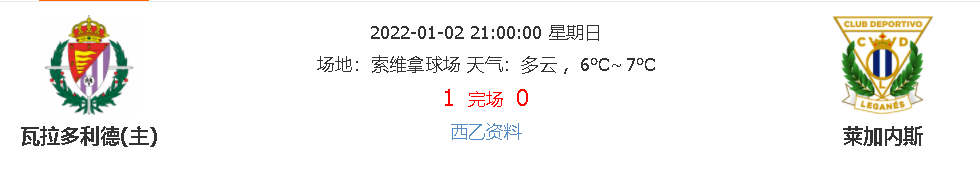 莱加内斯刚在1月2日进行了一场西乙赛事,目前休战3天,上一场比赛作客对战本赛季西乙前列的瓦拉多利德,双方战罢90分钟,最终以0:1惜败于对手,无法得分。