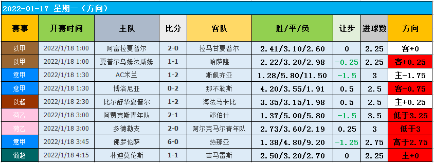 上期数据表现不错,高概率方向9场有6场顺利打出,调整完美!上期数据中,荷乙的表现最佳,2场都大获全胜打出,非常的精彩!意甲的表现也符合预期,3场有2场顺利打出,唯一想不到的是AC米兰居然在主场出了大冷门结果,非常的让人惊讶!英超近期表现依旧出色,近13场有9场顺利打出,非常的不错!今天的比赛较多,笔者挑选了部分晚场比赛出来作为本期的参考,希望能够打出对应的高概率方向!