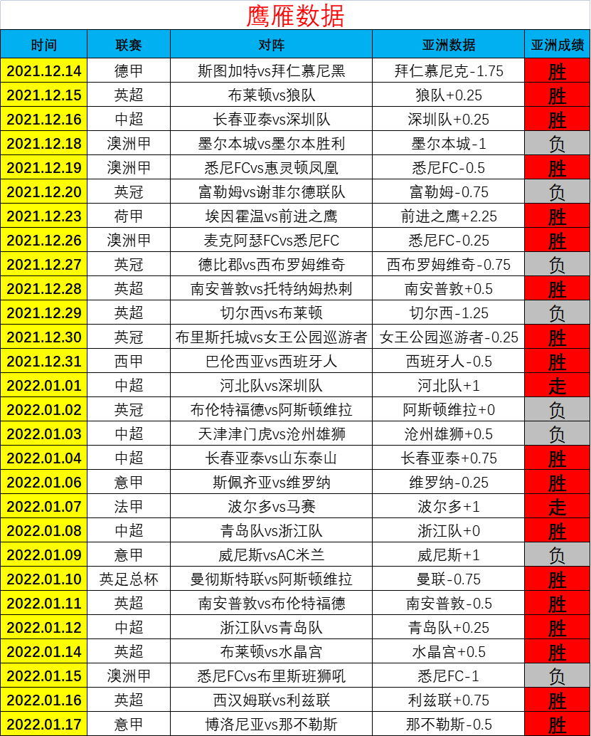 各位好,我是鹰雁,本人潜心研究亚洲数据走势变化及两队基本面之间的逻辑辩证关系,擅长结合热度走向分析足球,主攻亚洲数据,见解独特。作为15年的足球狂热分子,对足球历史数据,球队战术、状态及其心理素质综合面分析庖丁解牛,留下精华,希望能与各位共同分享足球带来的快乐!