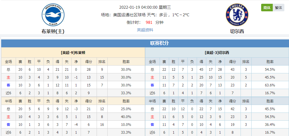 北京时间1月19日04:00,英超第24轮赛事,布莱顿对阵切尔西。布莱顿上一役主场战平后迎来各项赛事五连不败,再度坐镇主场的他们能否捍卫主场?切尔西上仗战败遭遇打击,相比布莱顿他们优势明显,球队此役能否复仇对手带走三分?