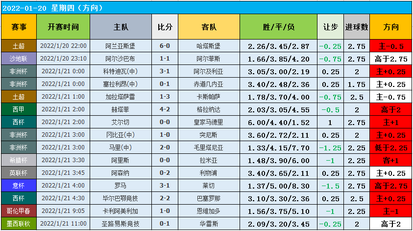 上期数据表现不错,晚场7场有4场顺利打出,夜场的8场有6场顺利打出!上期数据中,非洲杯的表现不错,4场有3场顺利打出,而且基本都是大获全胜的,非常的精彩,也非常符合数据的走势,而且打出率也一直维持70%以上,非常的深刻!而西系联赛也表现的非常不错,其中西杯都是顺利打出对应的方向,西甲则是以6球姿态完胜拿下进球数的方向,非常的精彩!当然最让人无奈的是早上的墨西联了,上半场的点球没能罚中,最终未能打出进球数的方向,颇为可惜的!近三天的数据走势非常完美,也是连续3天是斩获胜场了,非常的不错,继续努力收获更多!今天的比赛较多,笔者挑选了部分晚夜场比赛出来作为本期的参考,希望能够打出对应的高概率方向!