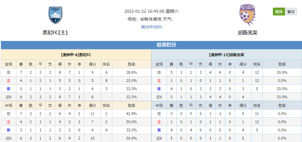 北京时间1月22日16:45,澳洲甲第23轮赛事悉尼FCvs珀斯光荣,悉尼FC上仗战败后止步四连不败,他们今仗坐镇主场能否重振旗鼓?珀斯光荣上仗战败,2连败的颓势仍然持续,此番客场走访是否已做好准备?