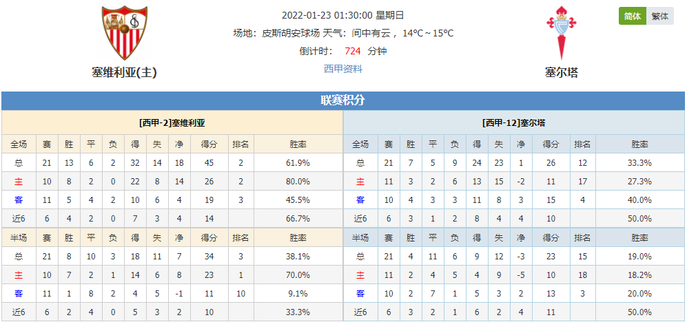 联赛战绩: 塞维利亚21战取得13胜6平2负的成绩,排名联赛第2位,进32球,失14球。塞尔塔21战取得7胜5平9负的成绩,排名联赛第12位,进24球,失23球。