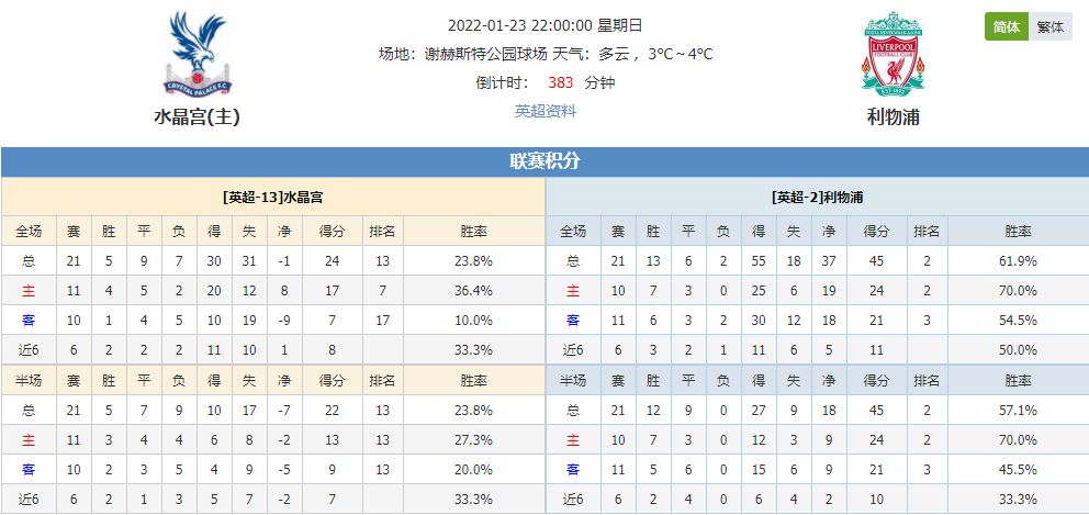 北京时间1月23日22:00,英超第23轮赛事水晶宫vs利物浦,水晶宫上仗战平对手后联赛颓势难止,他们今仗坐镇主场能否保住不失?利物浦迎来二连胜,此番客场走访又有几成信心?