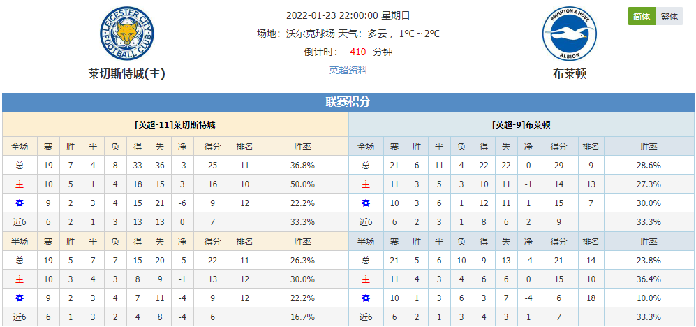 联赛战绩:莱切斯特城19战取得7胜4平8负的成绩,排名联赛第11,进33球,失36球。布莱顿21战取得6胜11平4负的成绩,排名联赛第9,进22球,失22球。