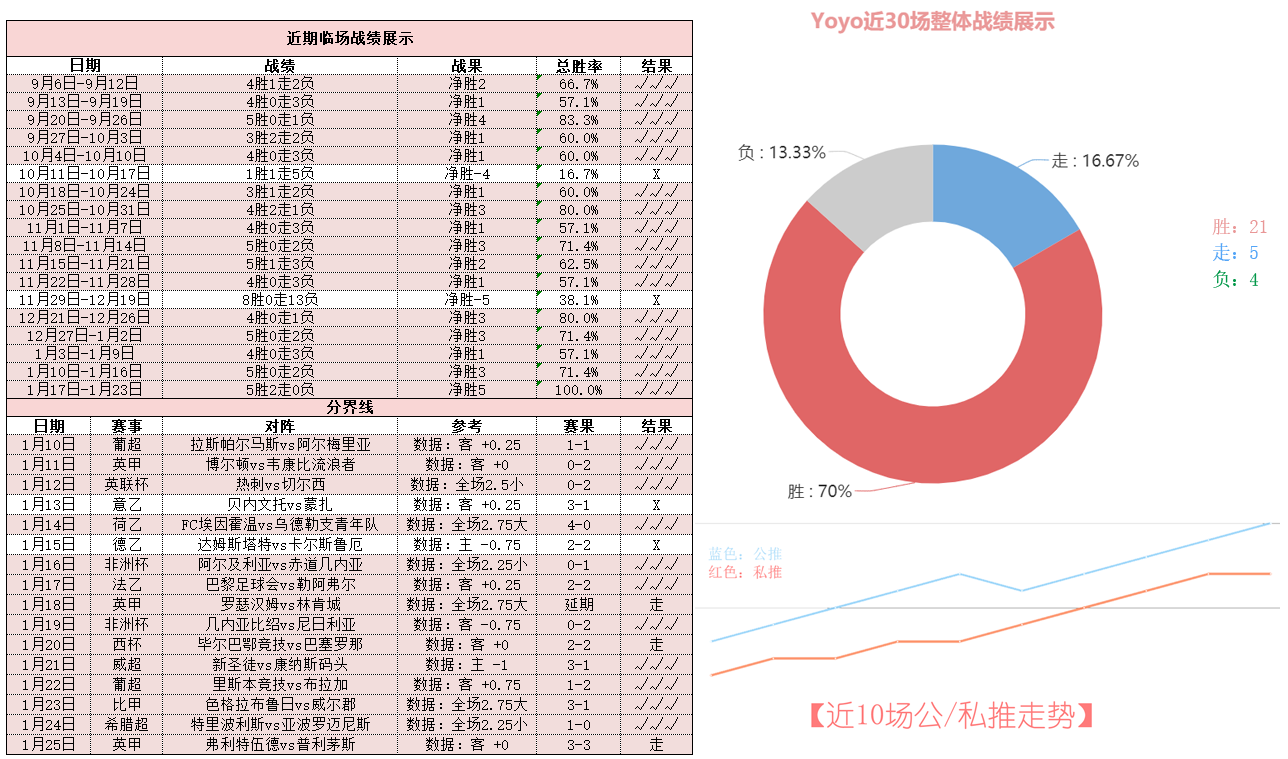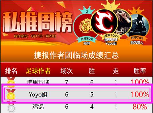 Hello,各位粉粉!我是Yoyo呀,小女子在捷报大家庭已经进驻良久,粉丝数在近段时间已经突破1.2w,感谢各位粉粉的支持呀!对于本人,近期整体战绩正值最佳的状态,其中最近核心临场正值七连胜的不俗战绩,而公推方向同样四连胜表现棒棒哒!看球赛是每日必修,对球赛有自己独到的见解和分析,擅长拆解赛事数据,稳中求胜,欢迎友友们持续关注哦~