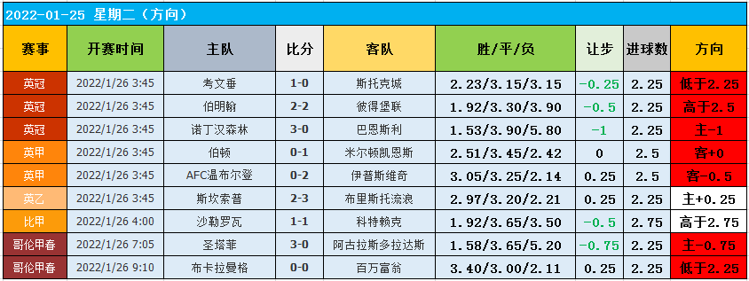 上期数据表现不错,晚场的6场有2场顺利打出,夜场的9场有7场顺利打出!上期数据中,非洲杯的表现平稳,不过在让步数方向,2场非洲杯都是大获全胜的,只可惜让步数据都不是最高概率的位置!而比甲2场都是杯卡在1-1的比分结束,未能打出进球数的方向,非常的可惜!而表现最出色的要数英冠和英甲,5场全部打出,而且都是大获全胜,非常的惊艳!当然早上的哥伦甲也是表现极其出色,尤其是圣塔菲,在染红的情况下,依旧以3-0强势拿下对手,非常的强大!近期西乙依旧保持高效的水准,近22胜15,打出率高达70%!同样的,非洲杯的表现也是非常的高光,近24胜17,打出率高达70%,相当的稳健!而英冠的表现更出色,近15胜12,打出率高达75%!今天的比赛较多,笔者挑选了部分夜场比赛出来作为本期的参考,希望能够打出对应的高概率方向!