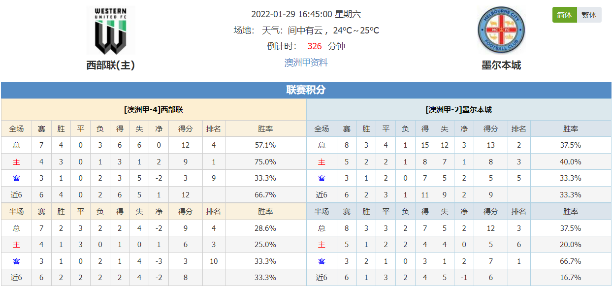 北京时间1月29日16:45,澳洲甲第9轮比赛正式拉开,此战由西部联坐镇主场迎战墨尔本城,西部联最近遭遇了2连败,状态下滑,本轮坐镇主场,球队能否利用主场优势重回胜轨?墨尔本城近期连续多场比赛保持不败,上轮联赛客场取得胜利,本轮再次作客,球队能否延续上轮比赛的优秀表现?