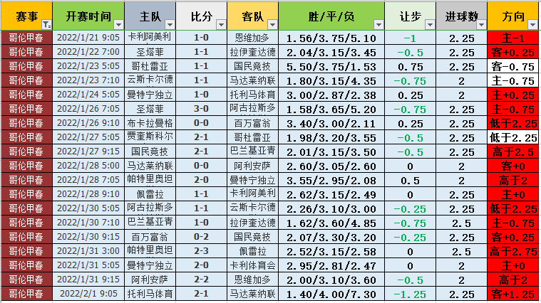上期数据表现一般,晚场的6场有2场顺利打出,夜场的5场有3场顺利打出!上期数据中,晚场的以甲表现较差,3场只有1场打出,而以超则是顺利打出对应的高概率方向,表现不错!夜场的表现不错,其中西乙成功回暖,进球数完胜打出,非常的漂亮!而最让人惊喜的是哥伦甲再次完美打出对应的数据,近3天哥伦甲比赛全胜,非常的稳健!近期非洲杯的表现是非常的高光,近31胜21,打出率高达68%,比较的稳健!而英冠的表现更出色,近22胜16,打出率高达73%!哥伦甲新赛季的表现是非常不错的,近19胜16,打出率高达84%!今天的比赛较多,笔者挑选了部分夜场比赛出来作为本期的参考,希望能够打出对应的高概率方向!