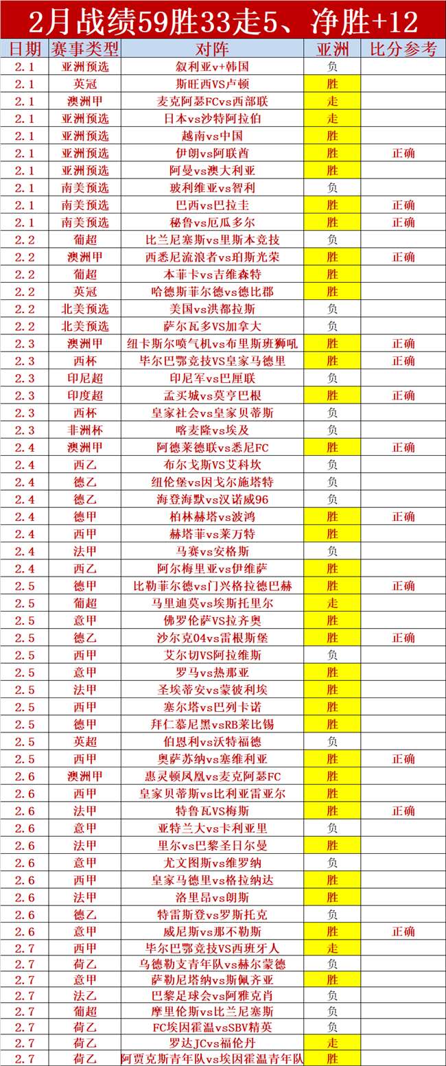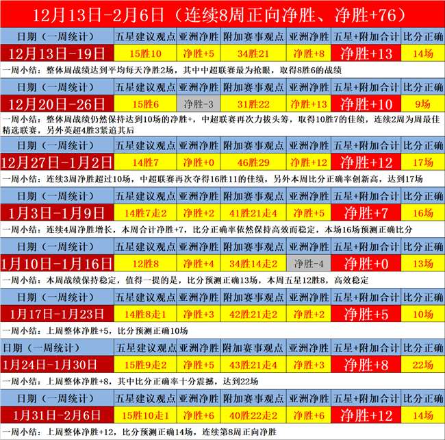 1、上周成功抓住不少冷门,上周成绩合计推55胜32走3,亚洲净胜+12,其中14场预测正确比分,目前2月份战绩59胜33走5,亚洲净胜+12,二月份势头正劲,推演士胜率高且稳定,至今已经连续8周正向净胜的成绩,目前过去7周战绩(12月13日-2月6日)合计净胜+67,本周继续稳步前行,再创巅峰战绩,温馨提示:一定要关注每一场比赛,推演士已经连续8周净胜增长,这并不是偶然,这是推演实力的见证,稳定的胜率基本已经上轨道。