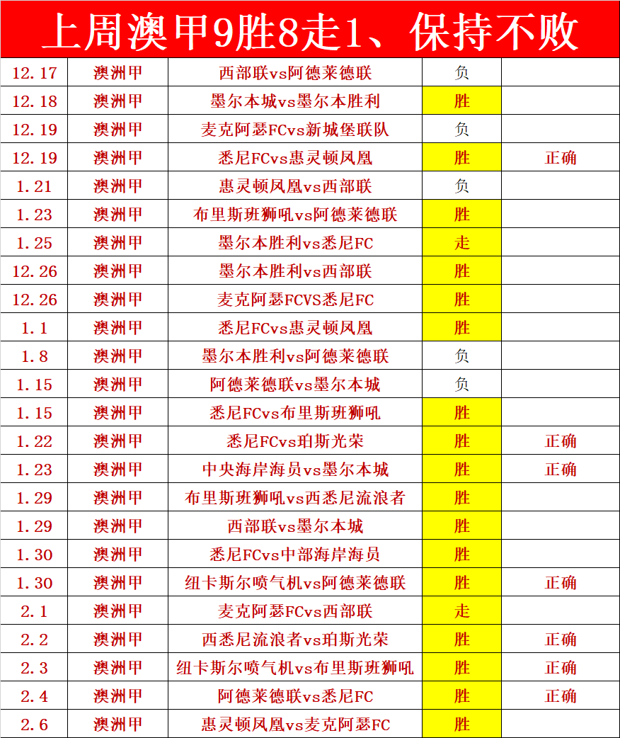 2、上周澳洲甲非常强悍,保持不败,9胜8走1,不败率100%