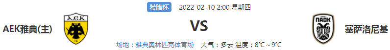 北京时间2022年02月10日02:00,希腊杯一场比赛,AEK雅典vs塞萨洛尼基,两队实力差距不算大,本场比赛结果会如何,让我们拭目以待。