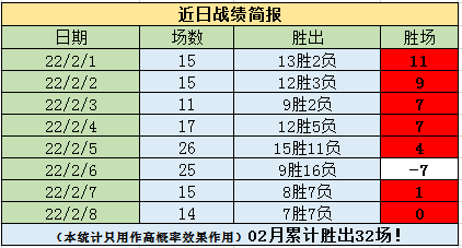 大数据栏目:本栏目将当天的赛事列出经由大数据分析得出的任何高概率选项供网友参考(期间若连续2天总胜率低于50%,将免费1期补偿)。现时大数据分析逐渐融入我们的生活当中,任何一个动作都能参照历史数据得出下一个行为是什么。足球作为一项竞技体育赛事,自然也离不开大数据的分析,在可供查找的数据中我们可以经过特殊的算法得出赛事的某些选项高频概率,而本栏目正是因此而创建。