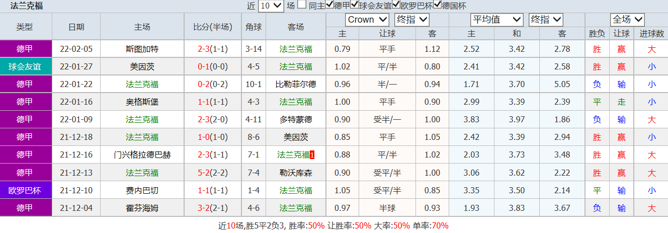 法兰克福作为德甲的中游球队,球队整体的阵容和实力尚可,本赛季联赛赛事取得8胜7平6负的成绩,打进33球,失32球,积31分。球队近期的成绩较为波动。上场联赛对战斯图加特,两队场面上表现激烈,上半场开局球队便轰入1球,取得领先,不过半场末段被对手斯图加特扳平;下半场开局球队再轰入1球,之后再被追赶扳平,还好紧接着球队再次轰入1球,实现领先,最终以3-2的比分获胜。