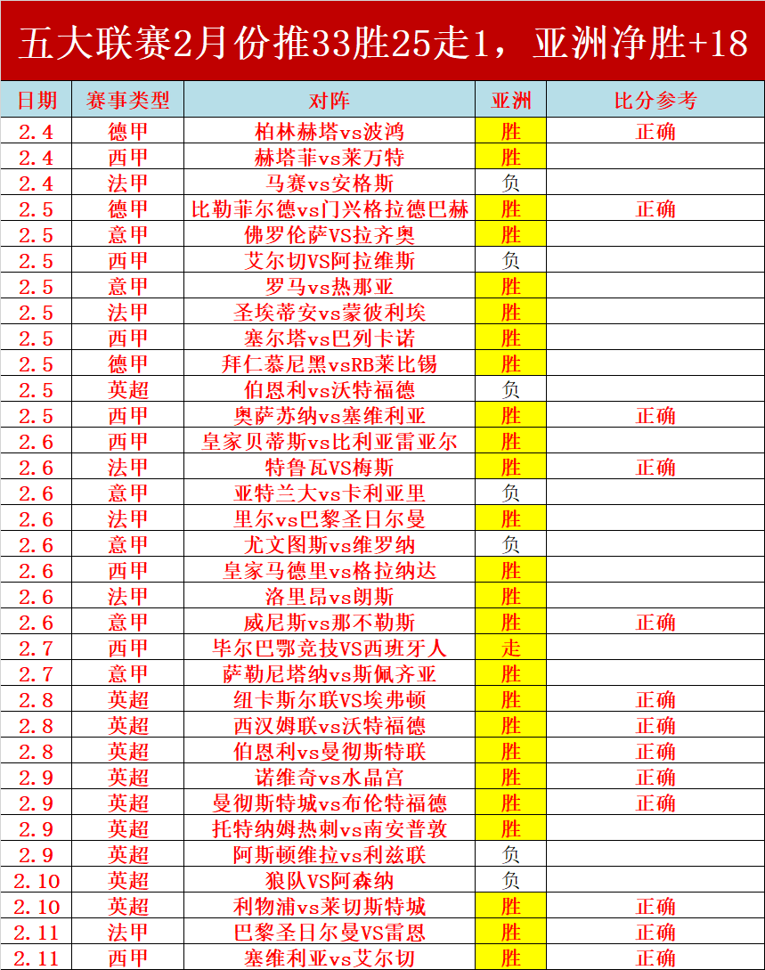 2、在二月份五大主流联赛合计共推33场,25胜1走,胜率高达76%
