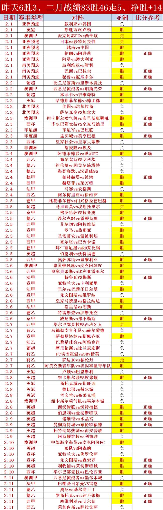 1、昨天6胜3表现依然稳定,3场比分都预测正确,其中西甲联赛赛维利亚的赛果值得称赞,思路和提醒都十分正确,目前二月份83胜46走5,亚洲净胜+14,二月份势头正劲,今天周末,同样也是笔者的强项,推演士胜率高且稳定,至今已经连续8周正向净胜的成绩,目前过去8周战绩(12月13日-2月6日)合计净胜+67,本周继续稳步前行,再创巅峰战绩,温馨提示:一定要关注每一场比赛,推演士已经连续8周净胜增长,这并不是偶然,这是推演实力的见证,稳定的胜率基本已经上轨道。