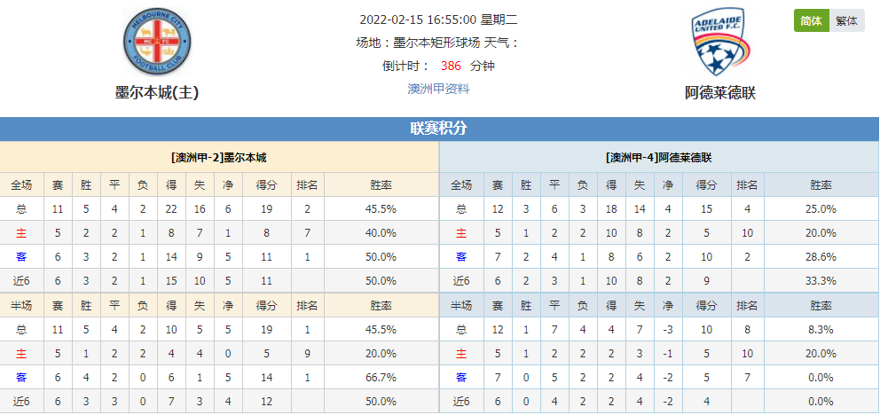 墨尔本城本赛季澳洲甲成绩5胜4平2负,积分19,排名第2;阿德莱德联本赛季澳洲甲成绩3胜6平3负,积分15,排名第4